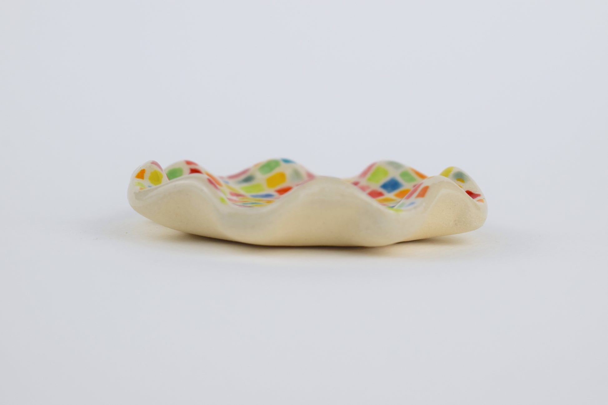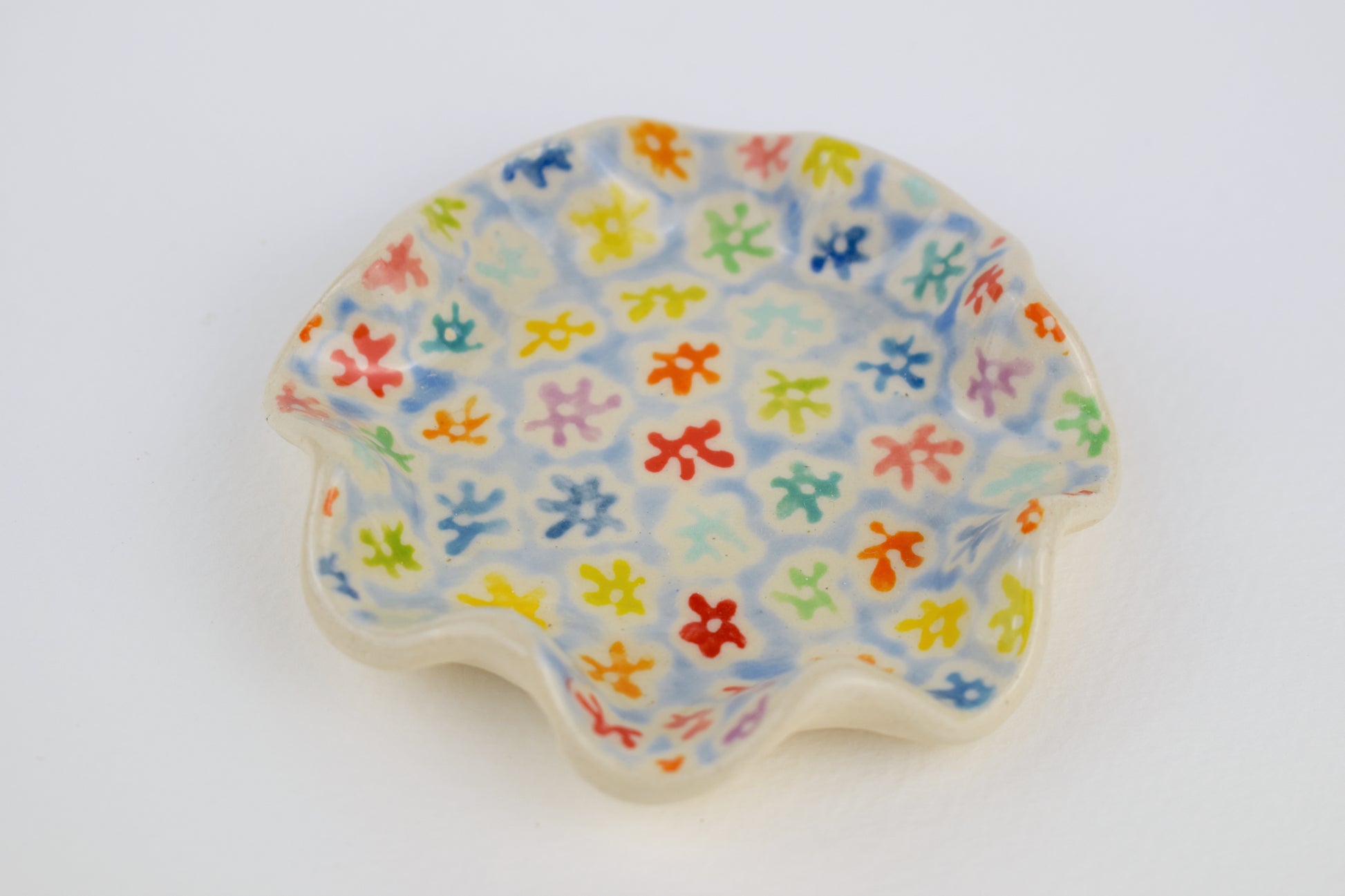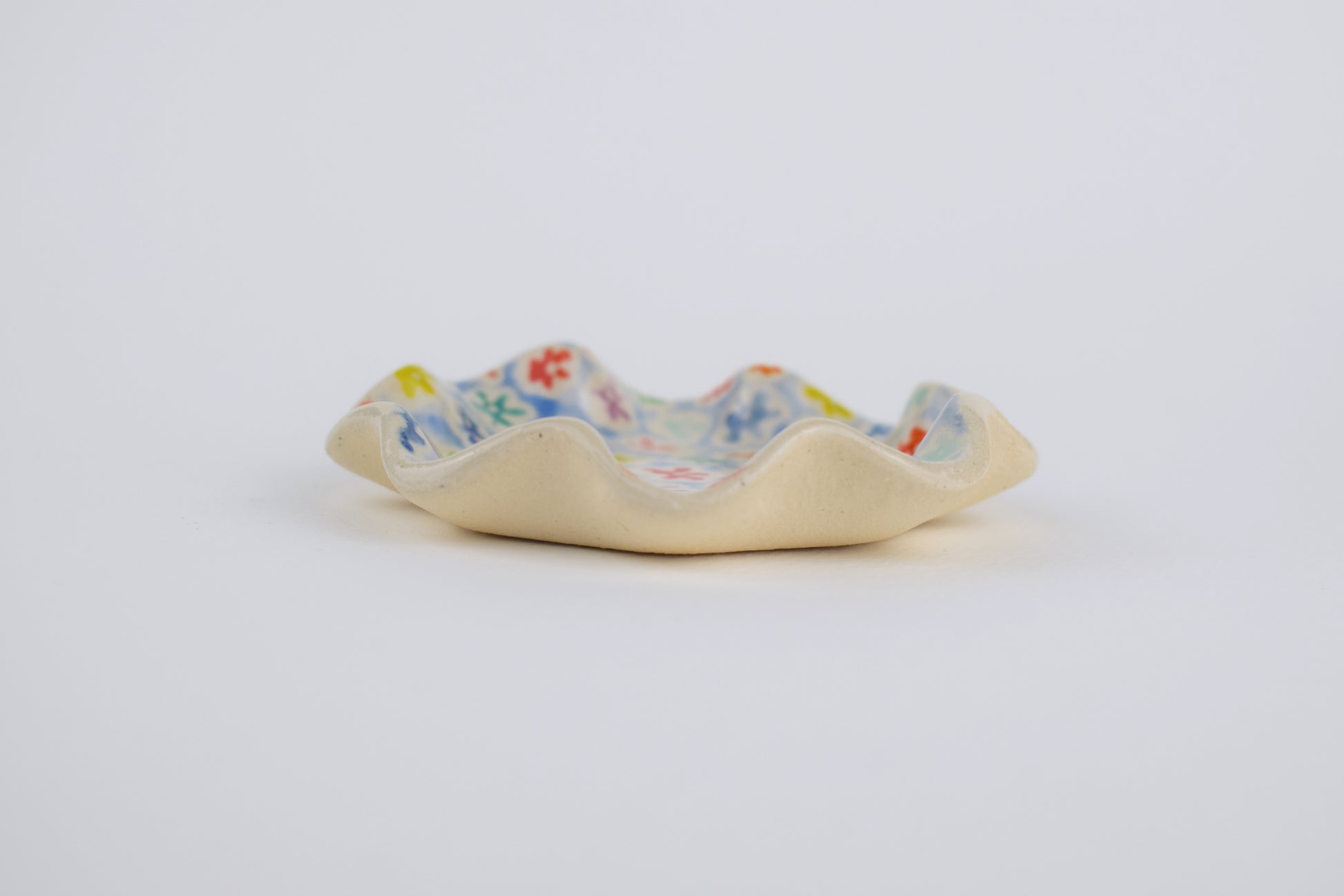 The Multicoloured Meadow Dish is a joyful, hand-formed ceramic made in my cosy home studio. Shaped with a soft, ruffled edge and fired twice to over 1200°C, this one-of-a-kind piece is decorated with tiny hand-painted flowers in a rainbow of glazes.
