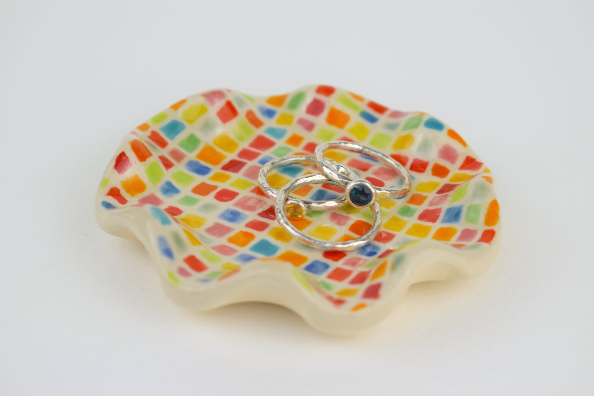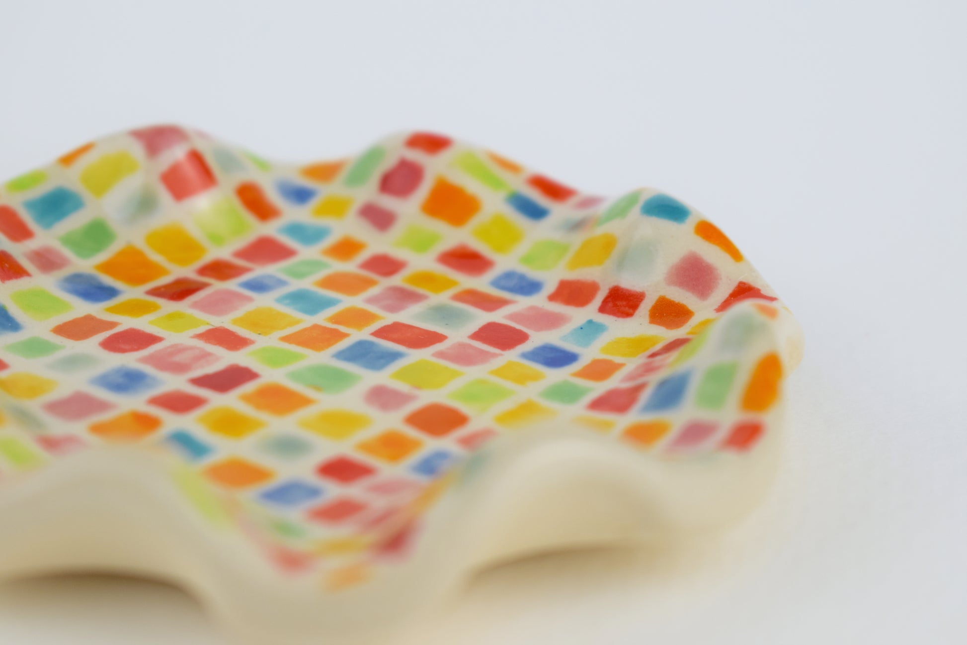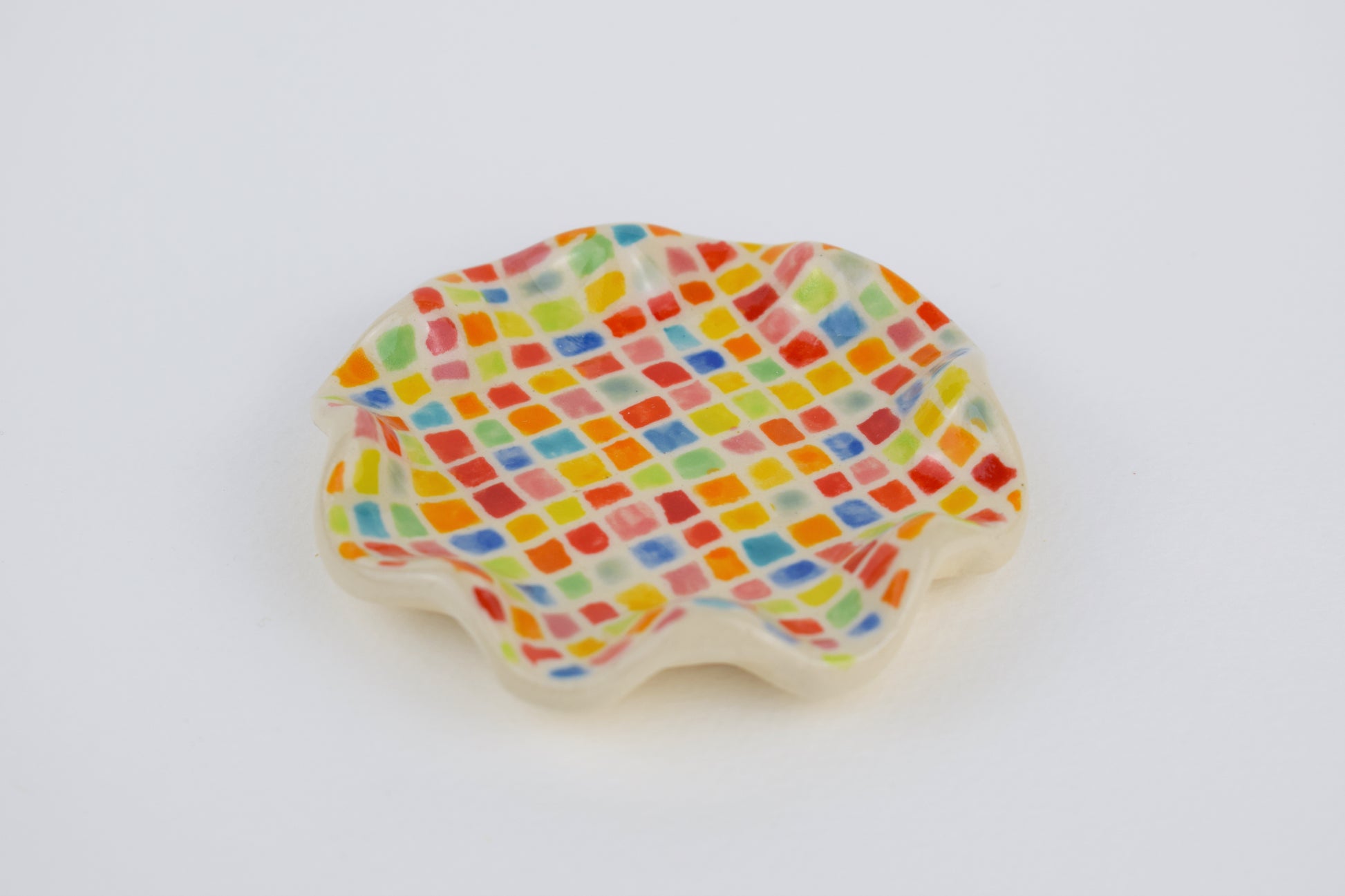 The Tiny Tiles Trinket Dish is a scolloped-edge ceramic, handmade and hand-painted in my cosy home studio. Fired twice to over 1200°C, this piece features a vibrant, painterly mosaic of colourful tile-like squares — each one applied by hand in layers of glaze.