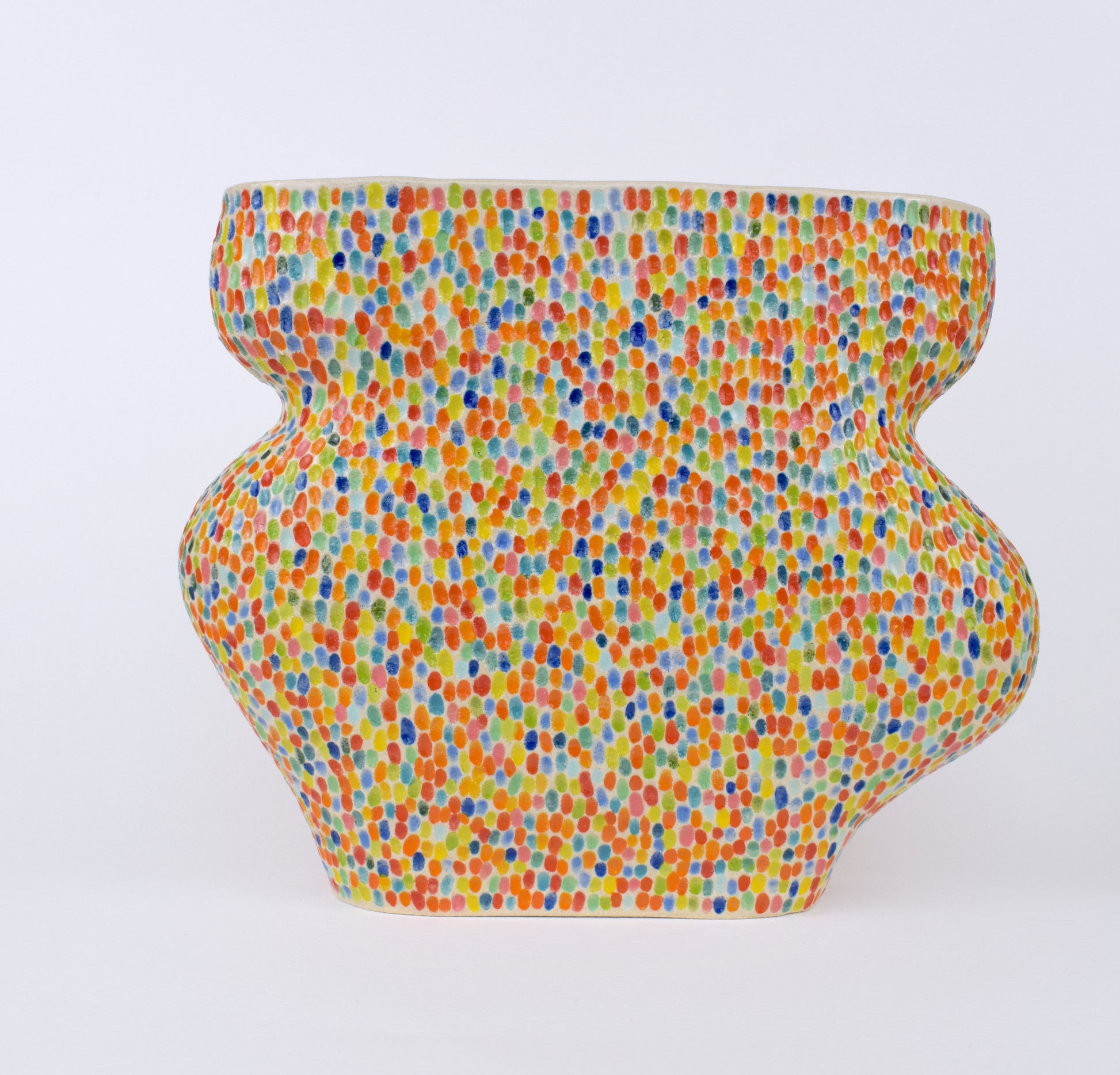 The vase is a highly decorative stoneware ceramic. Hand-built and fired to over 1000 degrees, each ceramic is unique in form! The vase is a one of a kind, with the vibrant pattern created through hand-painting layers of colourful glazes. Glazed on the inside with a transparent glossy glaze, each vase is sealed!