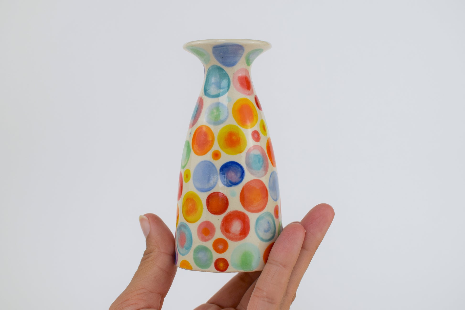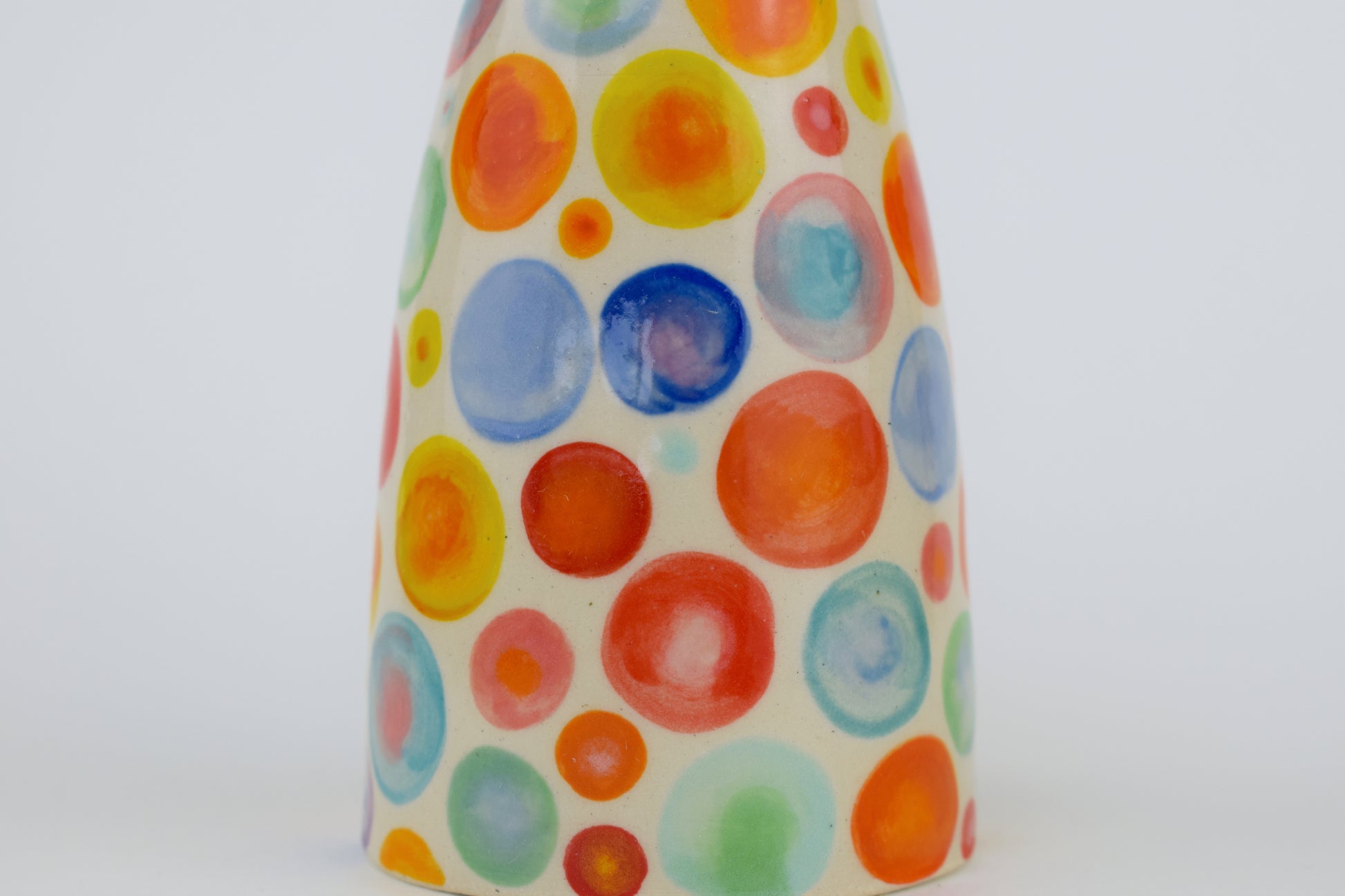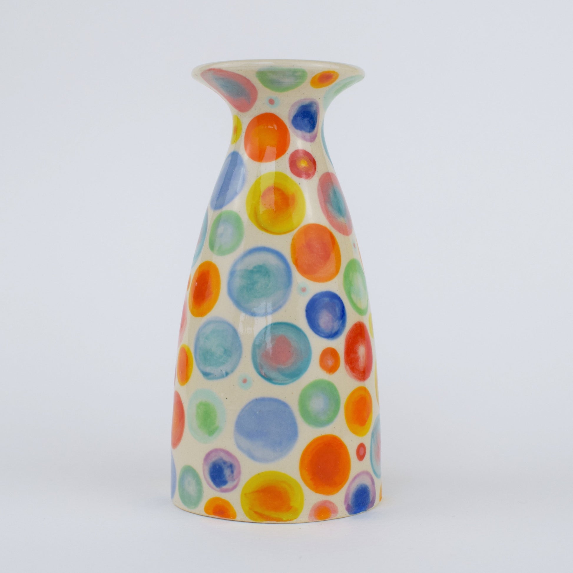 The Rainbow Spots Vase is a hand-thrown stoneware ceramic, carefully crafted in my cosy home studio and fired to over 1200°C. Its surface is sprinkled with joyful spots in a spectrum of vibrant rainbow colours, each spot bursting with energy and life. The playful scattering of hues brings a bright, cheerful rhythm that enlivens any space with a touch of whimsy and warmth.