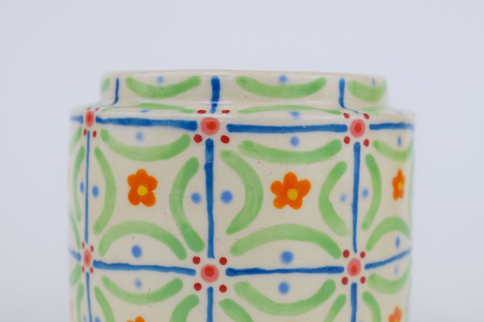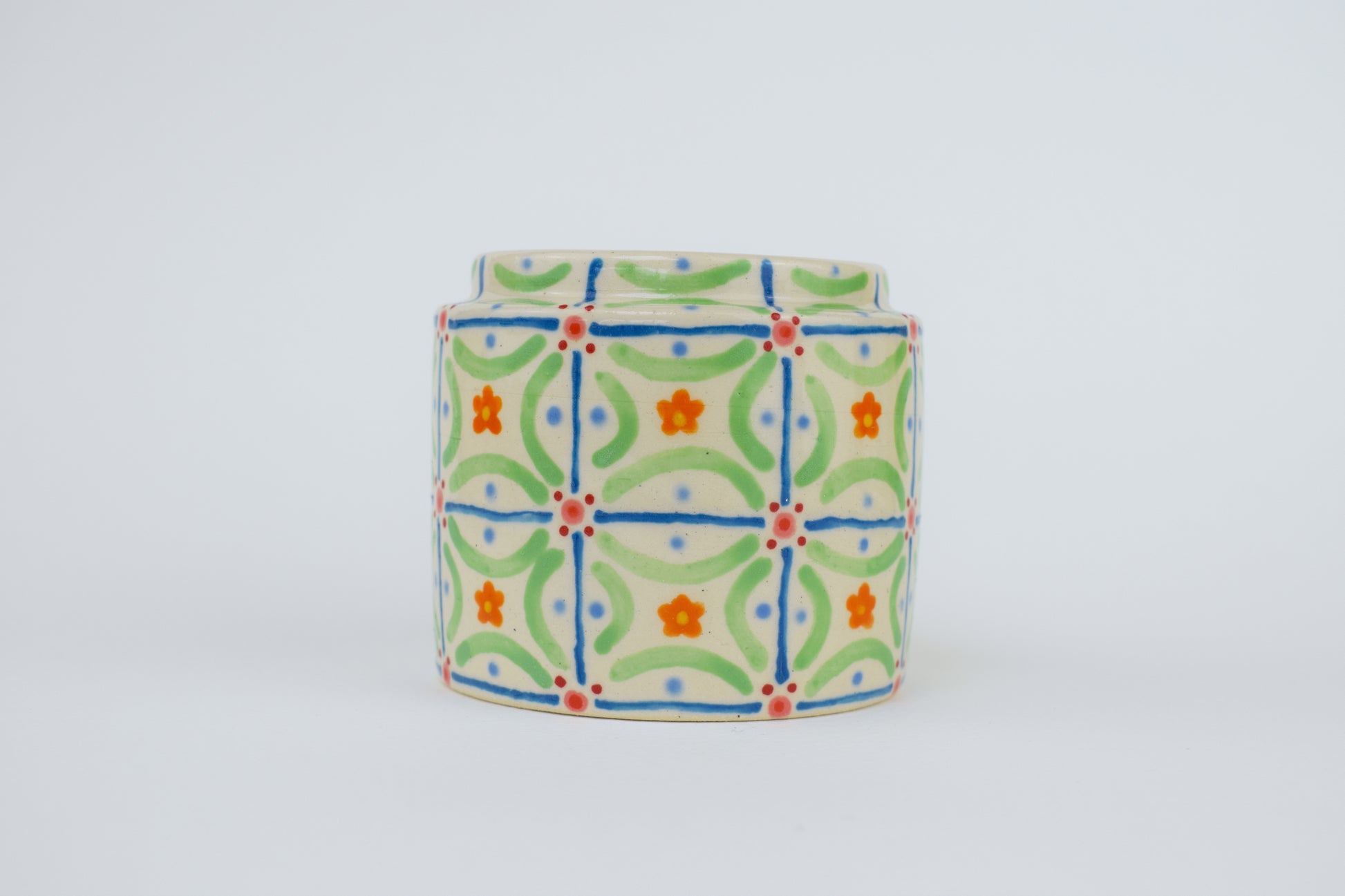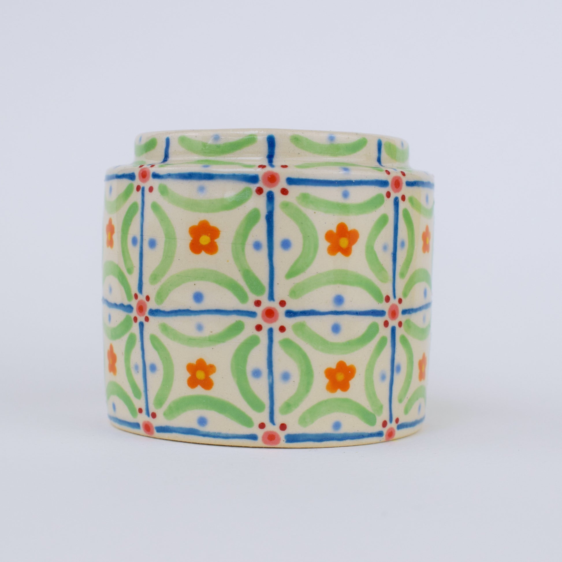 The Abstract Tiles Vase is a hand-thrown stoneware ceramic, crafted in my cosy home studio and fired to over 1200°C. Its surface is covered with a patchwork of small squares, each filled with unique abstract patterns that repeat like handcrafted tiles. The result is a balanced mosaic of shapes and colours, blending precision with playful spontaneity.
